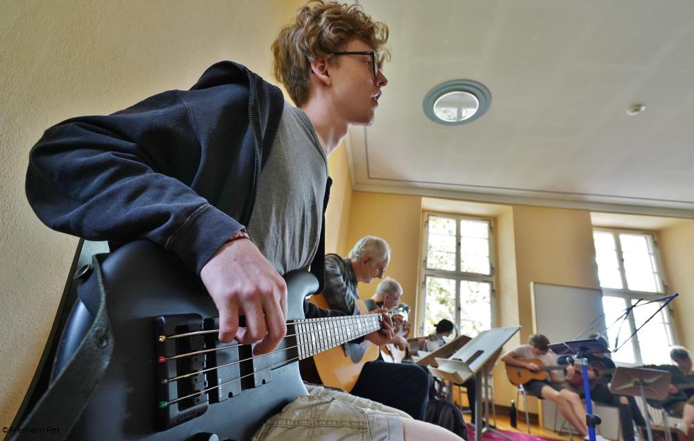 So wie auch Hannes Friske, 18 Jahre, der die Corona-Pandemie mit Online-Musizieren überbrückt hat. Seine fünfköpfige Familie ist auch beim Musiksommer der NaturFreunde, den sie seit dem Jahr 2013 nie hat ausfallen lassen. Hannes spielt seinen E-Bass in der Rockband, die sich schnell zusammenfand, ebenso wie im Gitarren-Workshop. Dort in einer Reihe mit älteren Herren, die den 18-Jährigen mit großer Selbstverständlichkeit bei sich aufgenommen haben.